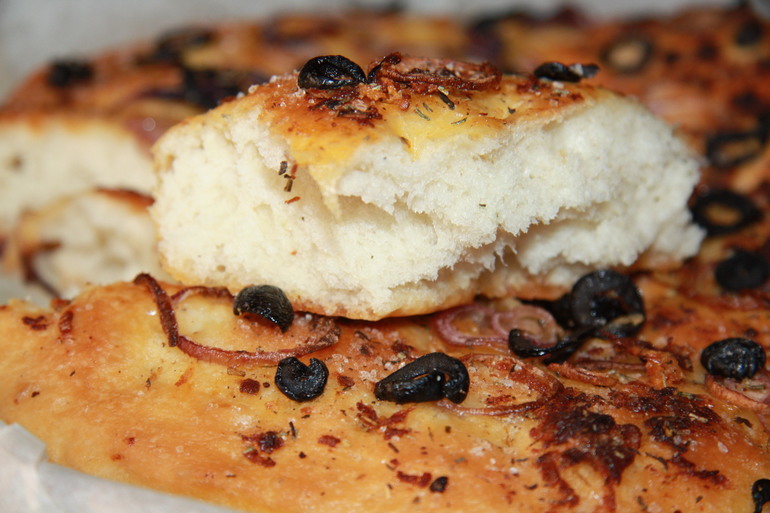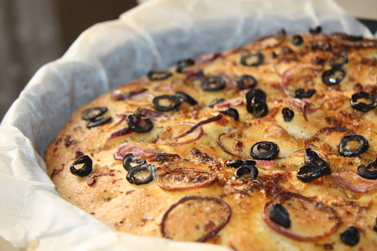 | Сегодня испекла на ужин: Фокача с красным луком и оливками.